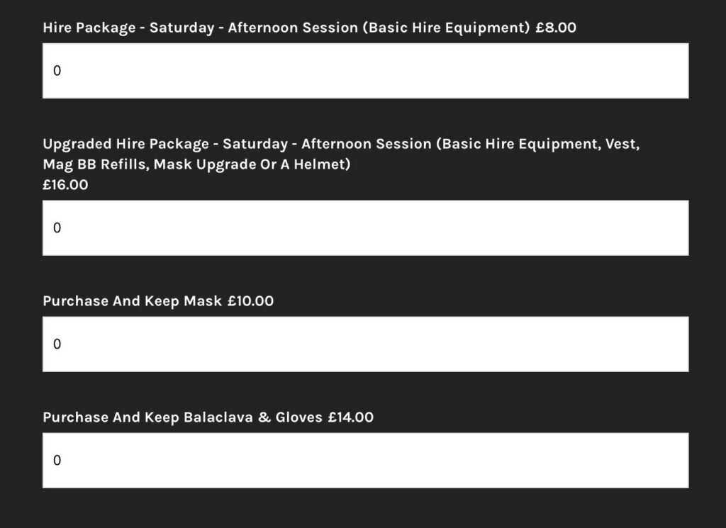 If you have selected the hire option, you will be receiving the above equipment on the day. On the next page, you will be offered various add-ons to enhance your gaming day experience.